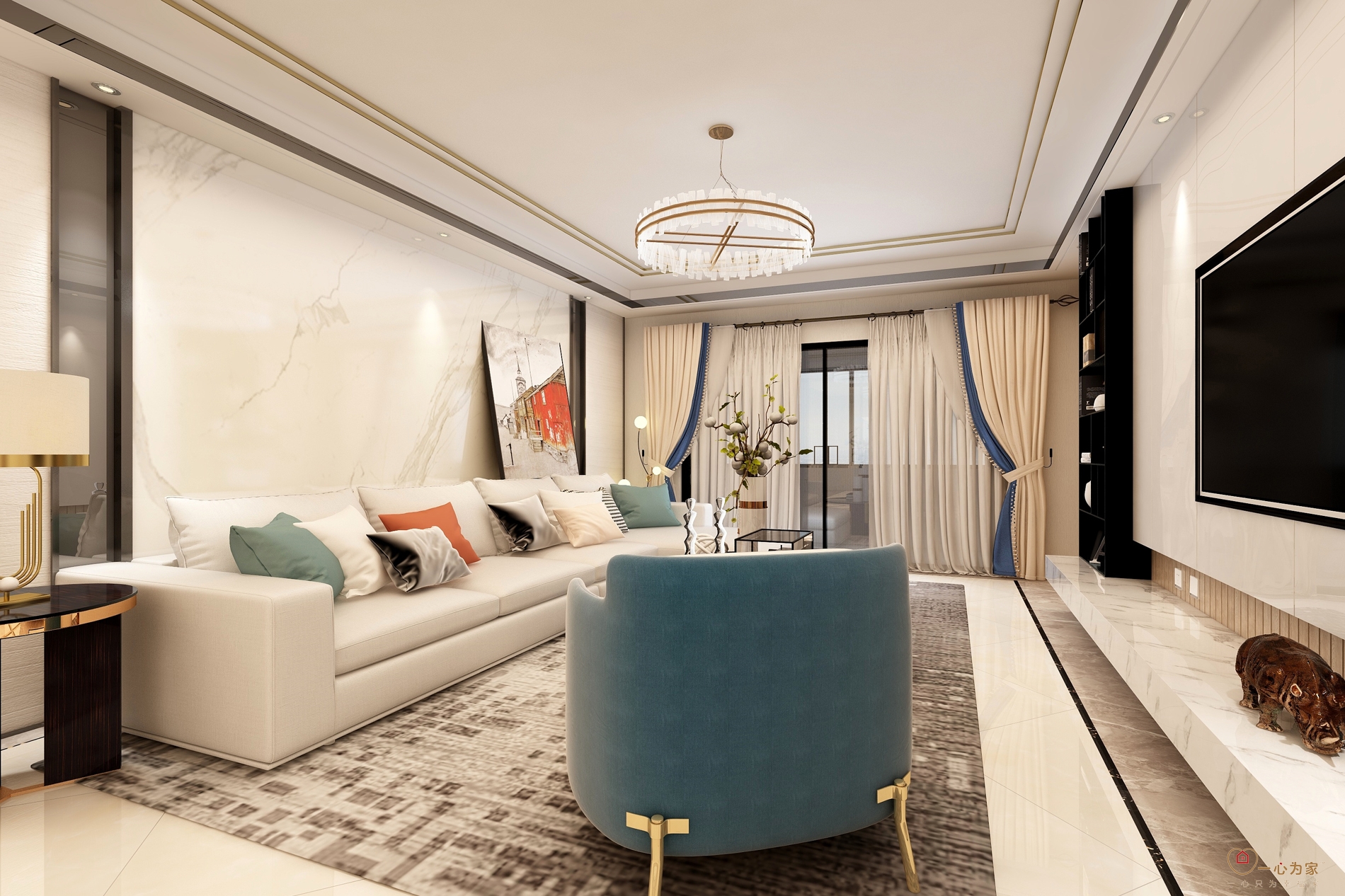 整个方案蓝色与白色灰色排列组合,克制又规律的展现出细致的美感,也在这种格调中显露出了柔软的一面。黑白灰在整个空间中带来简约、时尚的感觉。蓝色在空间里深浅不一,层叠不断的颜色低低叙述着自己的表达,方案中融入红色作为跳色,为整体空间设计增添不少活泼的气息。