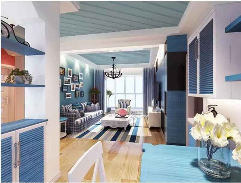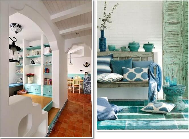 地中海风格是海洋风格装修的典型代表,因富有浓郁的地中海人文风情和地域特征而得名。地中海风格装修通过以海洋的蔚蓝色为基色调的颜色搭配方案,自然光线的巧妙运用,富有梦幻色彩的线条等软装特点来表述其浪漫情怀。明亮的天蓝色令人身心舒畅,仿佛置身于蔚蓝天空之下,又仿佛置身于凉爽海水的怀抱中。