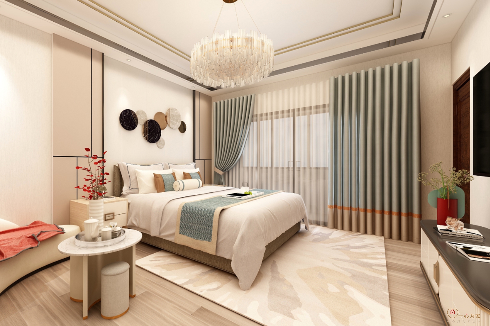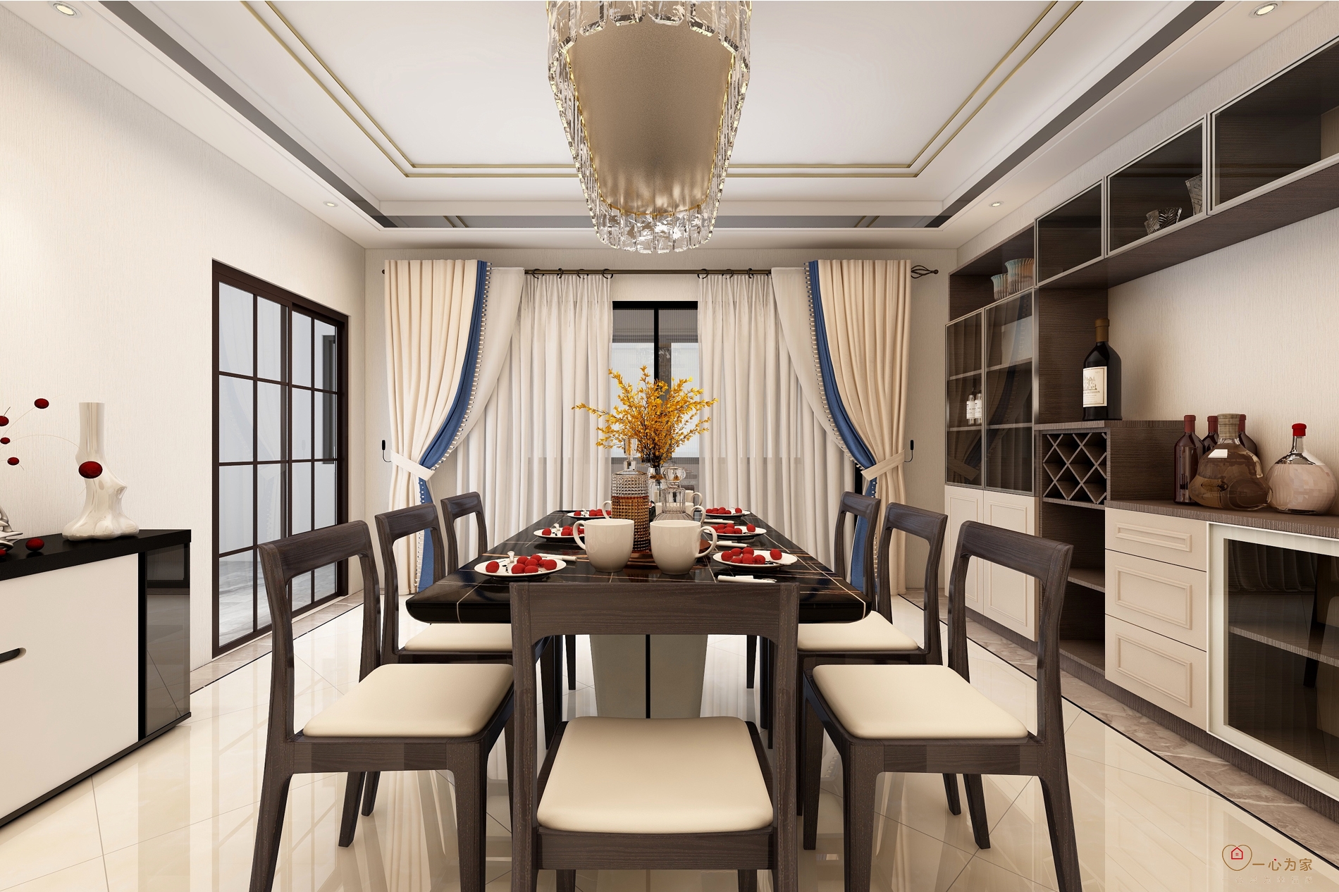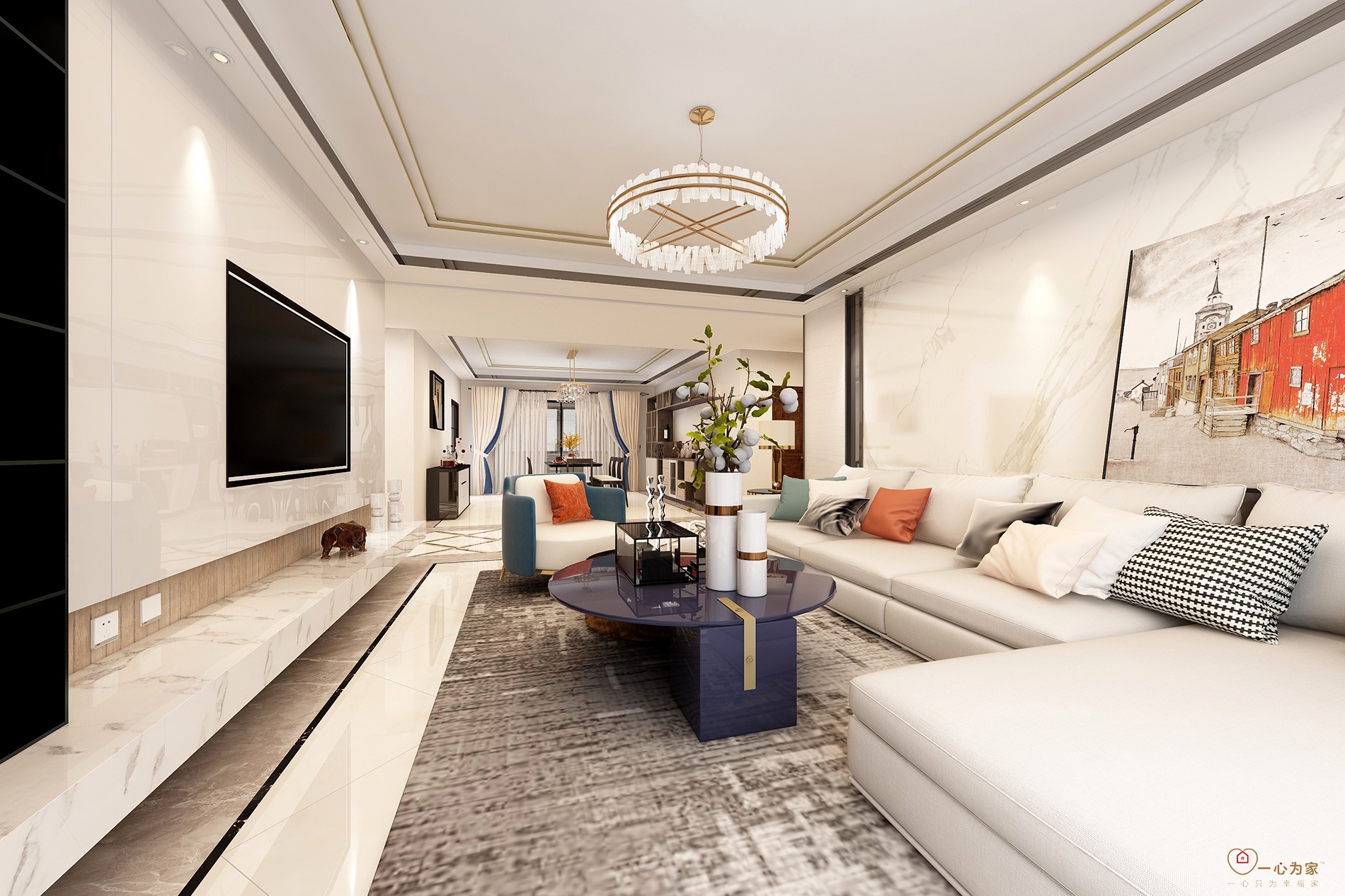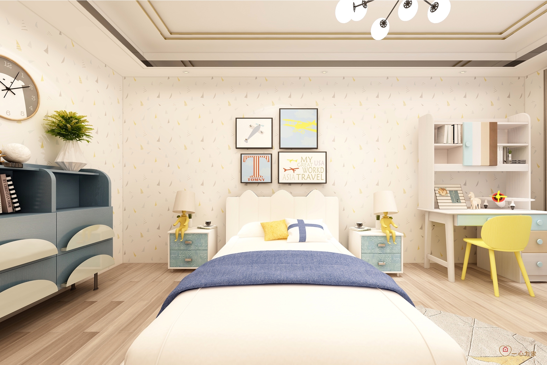 整个方案蓝色与白色灰色排列组合,克制又规律的展现出细致的美感,也在这种格调中显露出了柔软的一面。黑白灰在整个空间中带来简约、时尚的感觉。蓝色在空间里深浅不一,层叠不断的颜色低低叙述着自己的表达,方案中融入红色作为跳色,为整体空间设计增添不少活泼的气息。